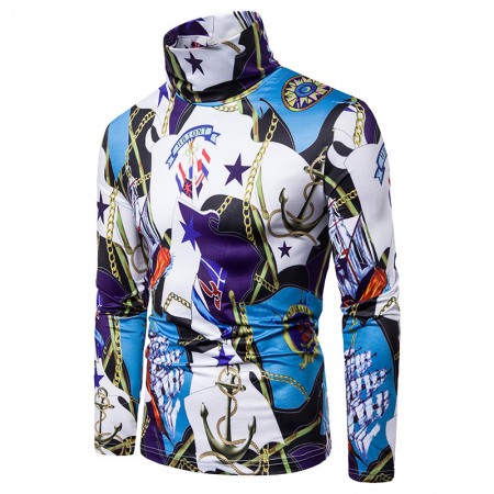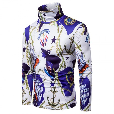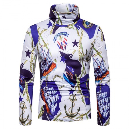 Men's Large Size 3D Blue Pattern Printing High Neck Long Sleeve T-Shirt Bottoming Shirt